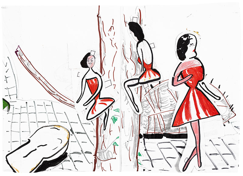 A painter of contemporary life, Wylie’s paintings and works on paper chronicle the times she has lived through, from her experience of the Blitz as a young girl, to more quotidian events such as a summer evening with friends. Arranged thematically, the exhibition begins with early memories of family life and bombing raids in London during the Second World War, recalled in paintings such as Rosemount (Coloured), 1999, (Private Collection) and Wing Tips and Blue Doodlebugs, 2022/23 (David Zwirner, London). As a student at Folkestone and Dover School of Art, Kent in the 1950s, Wylie studied anatomical drawing and figurative painting. Following a break in her career to raise a family, from the mid-1980s Wylie devoted herself to painting again, establishing a studio in her Kent house where she still works today. The exhibition presents Room Project 2002-3, Wylie’s first major series to receive significant critical acclaim. These works reveal Wylie’s voracious ambition to create large paintings that present an immersive, playful world, populated by cats, paper dolls, Olympic swimmers and the artist wearing a favourite checked skirt.